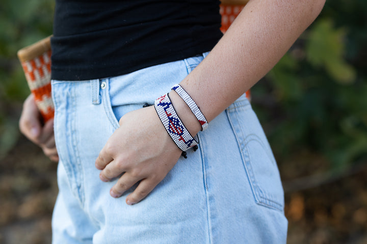 Designed with a white beaded body, it features a striking heart in the American flag pattern alongside a red and blue heartbeat line, symbolizing the pulse of patriotism and resilience. Measuring 0.5 inches wide and 6 inches long, this bracelet is finished with an adjustable pull-string for a custom, comfortable fit. Our handmade beaded bracelets for women or man are crafted with natural beads for bracelets and are ideal for those who love women's jewelry or mens fashion with a unique, earthy vibe.