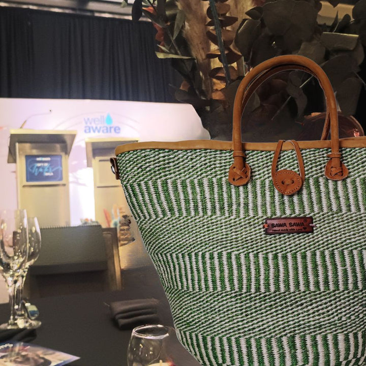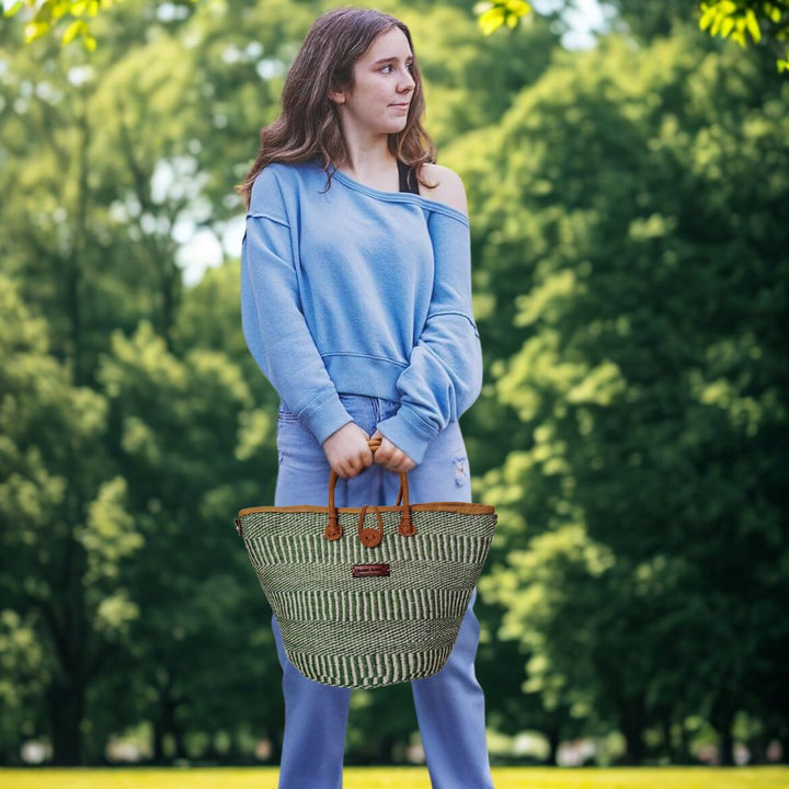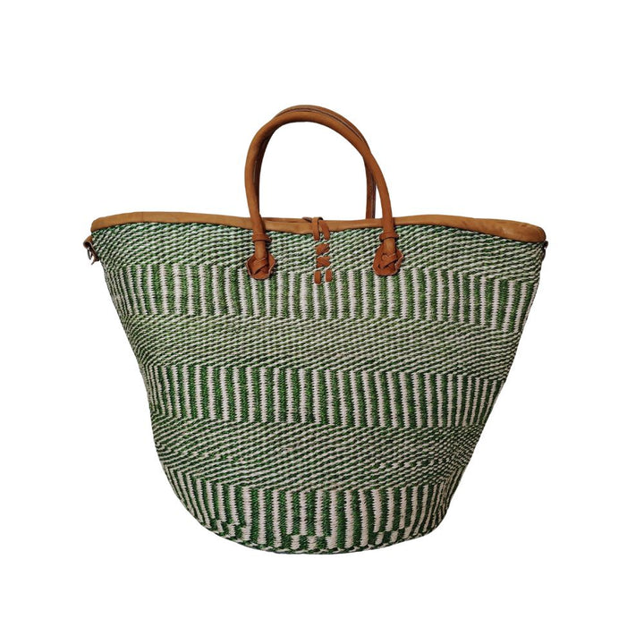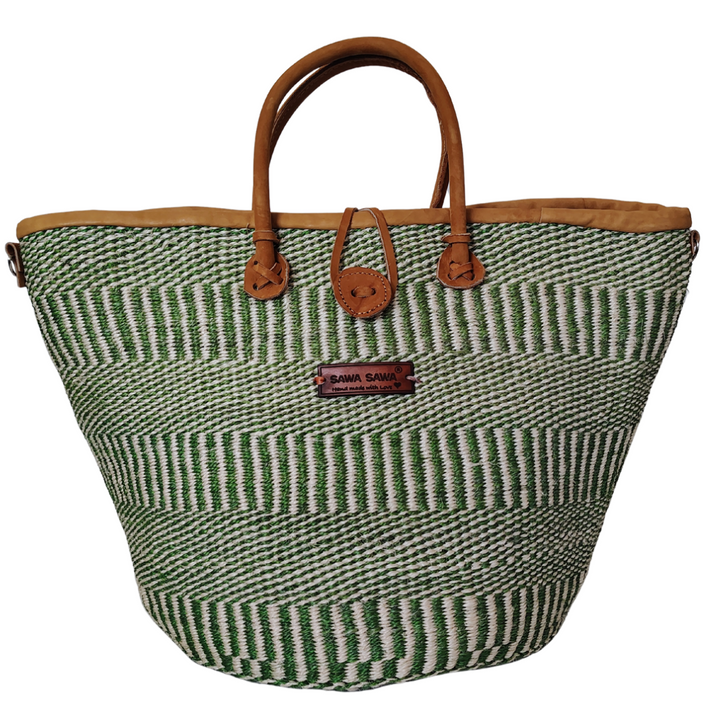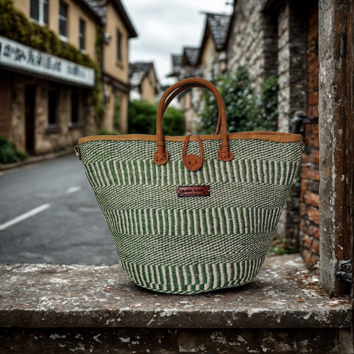 SAWA SAWA Evergreen Wholeness Handmade Sisal Straw Basket Tote - Green & White Sisal Tote with Leather Trim