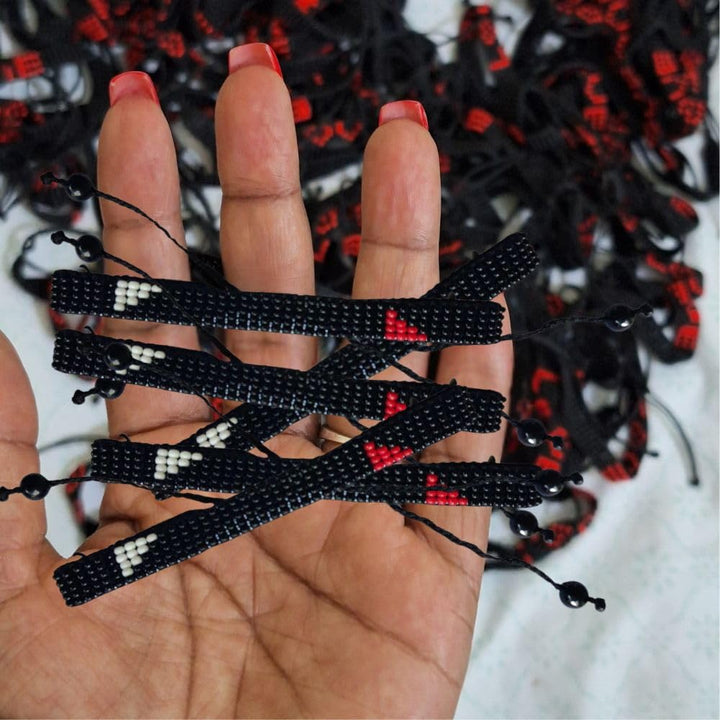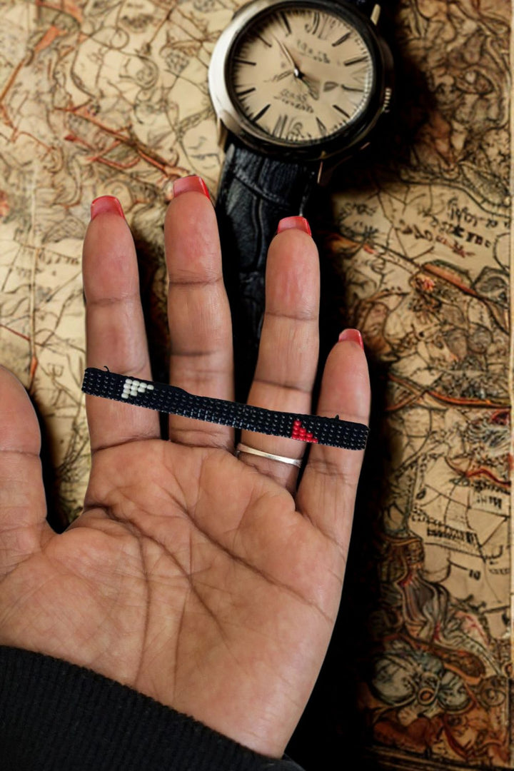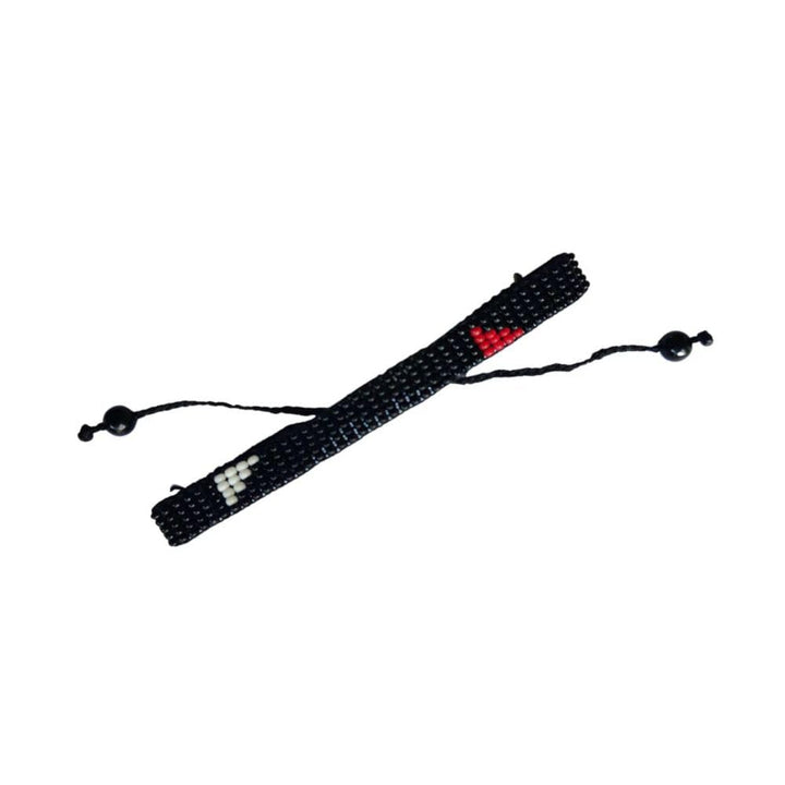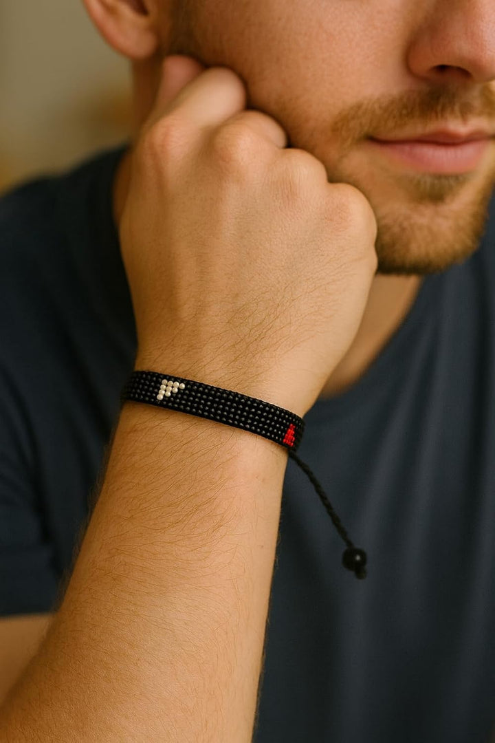 Crafted in a sleek black bead design just under 1 centimeter wide, this bracelet carries a subtle yet powerful message. Two minimalist triangle motifs — one in red and one in white — are woven into the dark beads. Each triangle adds a whisper of meaning: